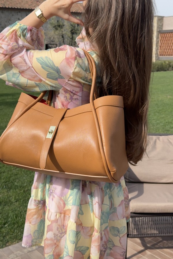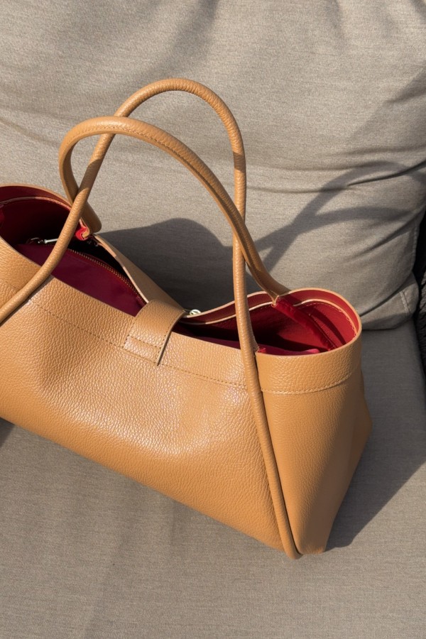 Torebka Sannah to połączenie klasyki i funkcjonalności w najlepszym wydaniu. Wykonana z najwyższej jakości skóry naturalnej, zachwyca prostym, ale jednocześnie bardzo eleganckim designem. Czerwony środek torebki dodaje jej niepowtarzalnego charakteru, a kosmetyczka w tym samym kolorze w środku to świetne rozwiązanie na przechowywanie drobiazgów. Złote akcenty podkreślają jej premium charakter, a duża przestronność zapewnia wygodę użytkowania. Idealna zarówno na co dzień, jak i na specjalne okazje.