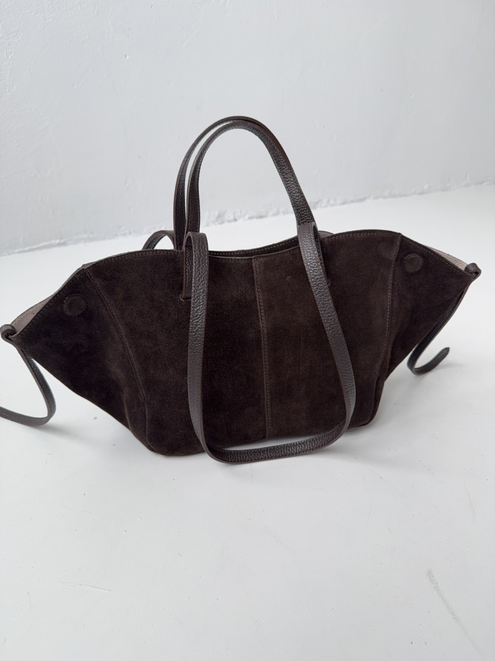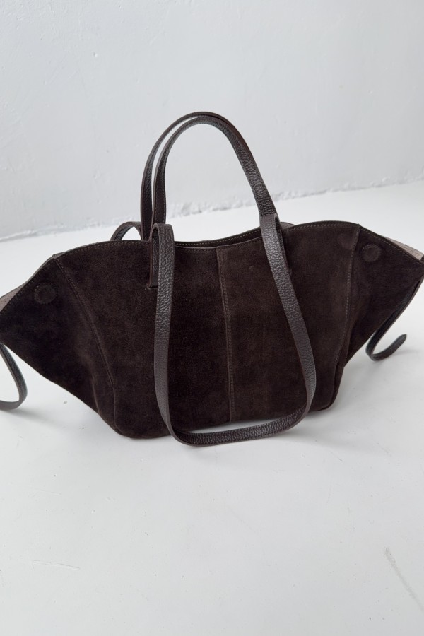 Torebka Valeria to model, który wyróżnia się nie tylko eleganckim wykończeniem, ale też wyjątkowym, geometrycznym kształtem. Wykonana z naturalnej skóry zamszowej w głębokim czekoladowym odcieniu, przyciąga spojrzenia i stanowi mocny punkt każdej stylizacji. Długie paski po bokach można subtelnie związać lub zostawić luźno – zależnie od stylu, jaki chcesz uzyskać.