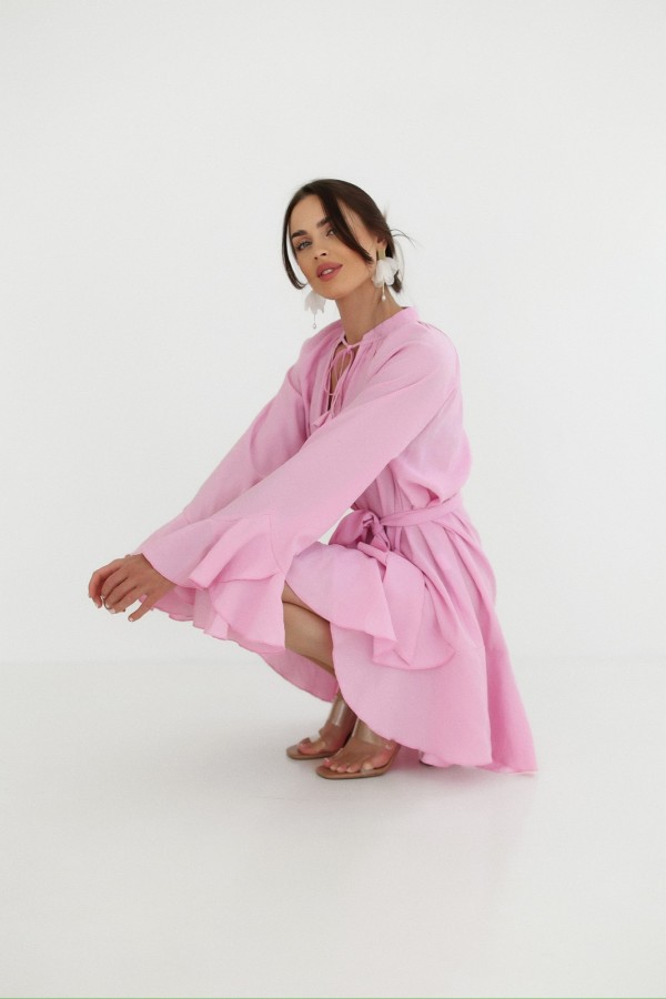 Różowa sukienka Charm to połączenie delikatności, świeżości i wyrazistego stylu. Jej luźny fason z wiązaniem przy dekolcie oraz falbankami przy rękawach i na dole nadaje sylwetce lekkości i subtelnego uroku. Wykonana w 100% z miękkiego tencelu – materiału znanego z lekkości, przewiewności i szlachetnego wykończenia – zapewnia komfort przez cały dzień. Model pięknie się układa i cudownie wygląda w ruchu. Ściągana w talii – pozwala dopasować sukienkę do figury, subtelnie podkreślając kobiece kształty. To idealna propozycja na każdą porę roku – zestaw ją z kozakami, botkami albo letnimi sandałkami i poczuj się wyjątkowo!