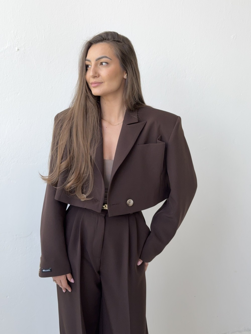 Marynarka Erica w odcieniu głębokiej czekolady to propozycja dla kobiet, które lubią klasykę z pazurem. Krótszy krój typu short i oversize’owa forma z poduszkami na ramionach tworzą nowoczesny, wyrazisty look, który świetnie podkreśla sylwetkę. Ten intensywny kolor dodaje stylizacji głębi, klasy i elegancji – idealnie sprawdzi się zarówno w zestawieniu total look, jak i w codziennych stylizacjach z jeansami.