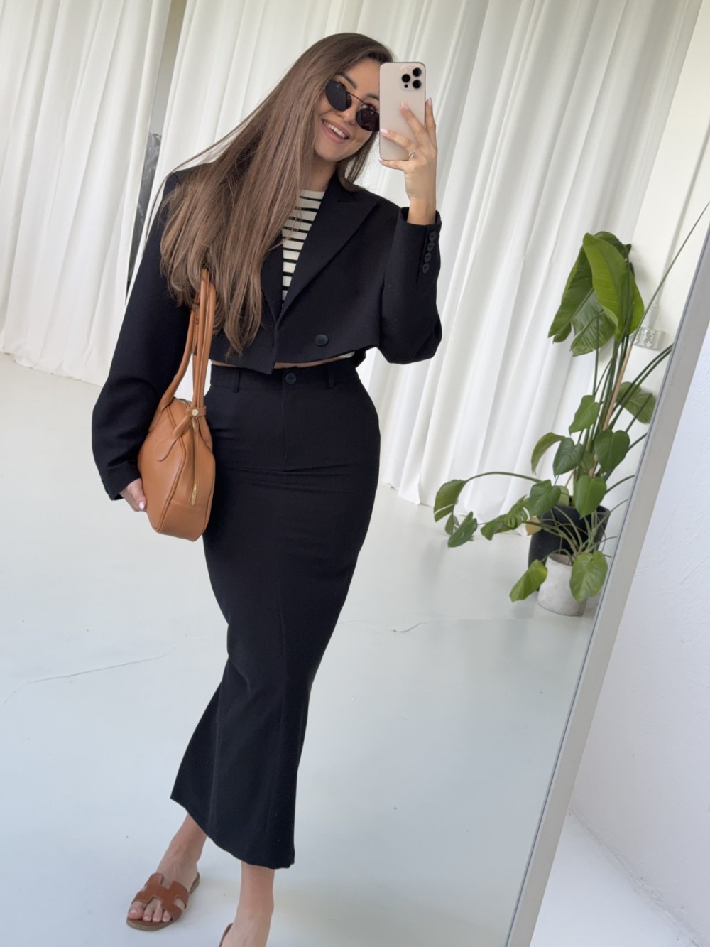 Spódnica midi Erica w kolorze klasycznej czerni to ponadczasowa baza każdej eleganckiej stylizacji. Jej dopasowany, ołówkowy krój pięknie podkreśla kobiecą sylwetkę, a elastyczny materiał zapewnia wygodę i komfort przez cały dzień. Lekko prążkowana tkanina pracuje z ciałem, subtelnie modelując talię i biodra. Założysz ją zarówno do koszuli i szpilek, jak i w bardziej casualowej wersji z T-shirtem i sneakersami. To jeden z tych elementów garderoby, który zostanie z Tobą na długo – idealny do biura, na spotkania i wieczorne wyjścia.