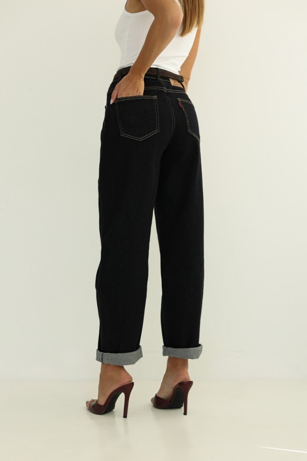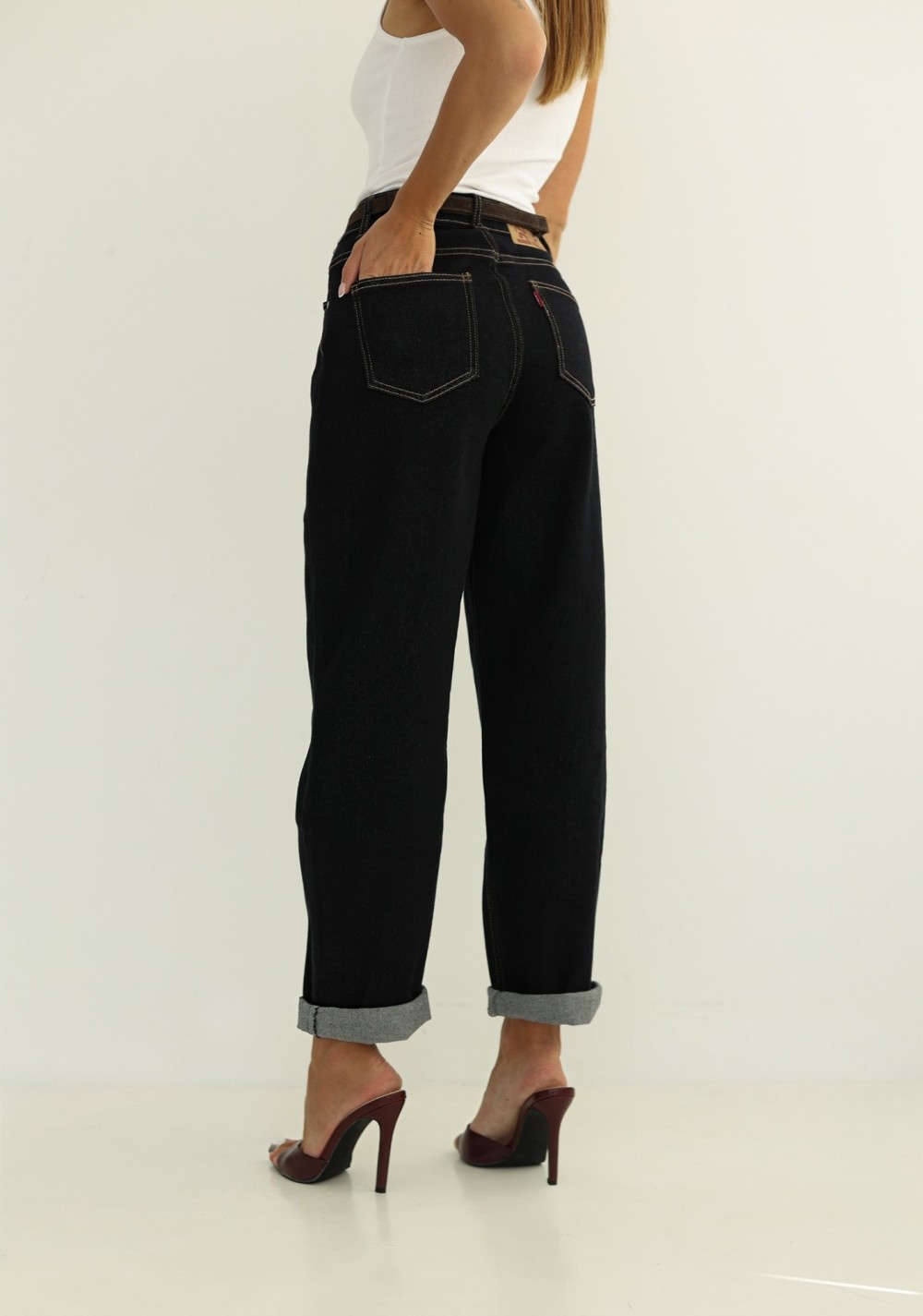 Modne dżinsy o kroju balloon. Spodnie damskie ułożą się świetnie na każdej sylwetce, a przy tym zapewnią komfort noszenia. Zostały uszyte z mocnego denimu. Możesz być pewna, że posłużą Ci dłużej niż jeden sezon. Do granatowych jeansów z szerokimi nogawkami dopasuj krótki top oraz oversize’owy sweter. Na nogi włóż botki.