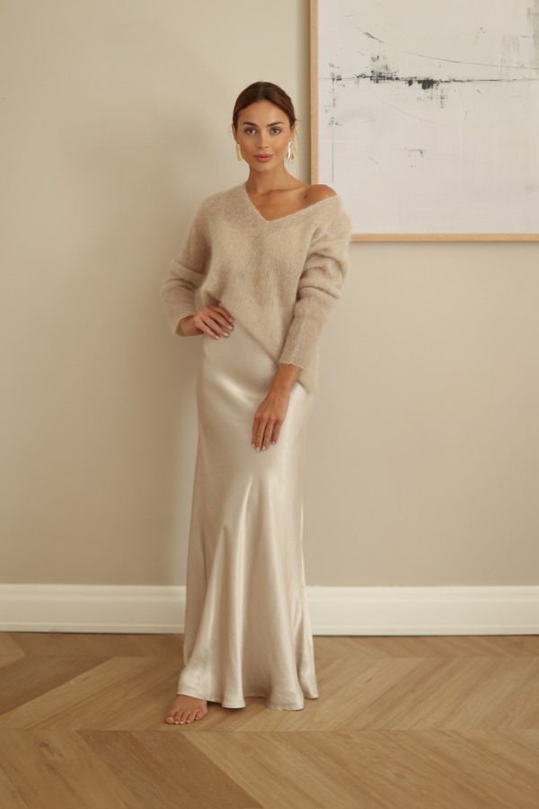 Sweter premium z kid moheru 80% Sofi dekolt V beżowy