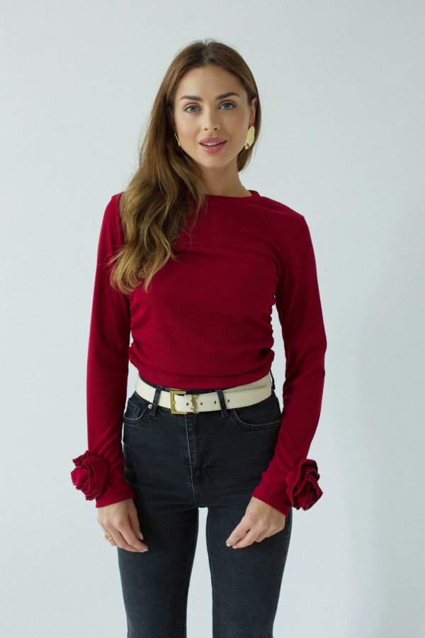 Piękna bluzka w kolorze bordowym. Zdecyduj się na nią, jeżeli lubisz ozdobne detale i przylegające fasony. Ten model doskonale uwydatni górne partie sylwetki, a bordowy odcień doda stylizacjom kobiecego wdzięku. Bluzka damska z różami na rękawach będzie się świetnie prezentować razem z czarnymi spodniami.