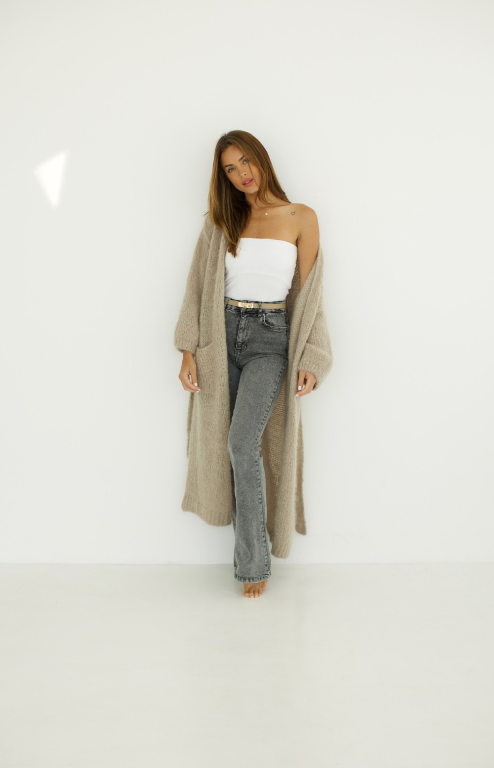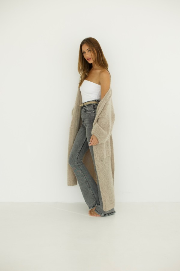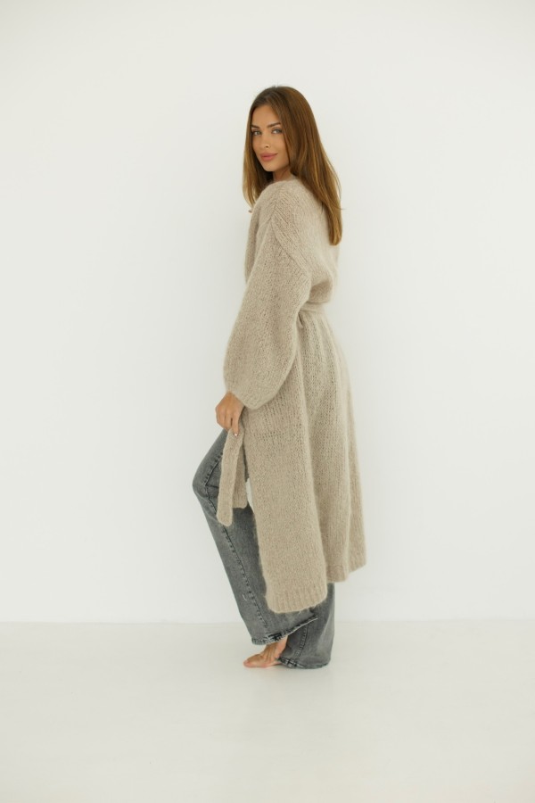 Kardigan długi z wiązaniem 55% moher beżowy