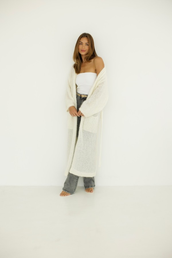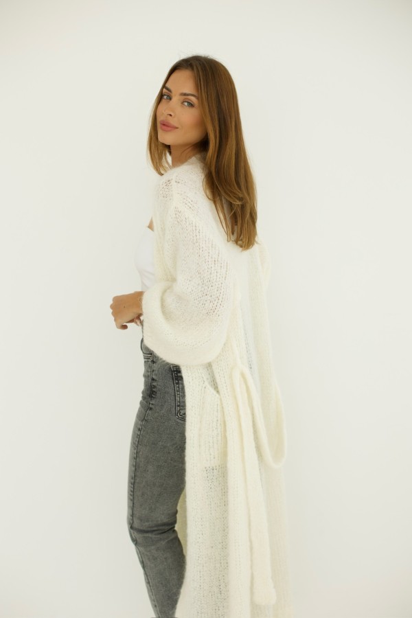 Prosty kardigan w kolorze ecru. Uniwersalny sweter został uszyty z przyjemnej w dotyku, niegryzącej dzianiny, dlatego będzie Ci w nim bardzo wygodnie. Dłuższy model z wiązaniem okaże się fantastycznym uzupełnieniem casualowego czy eleganckiego outfitu. Kardigan damski połącz z dopasowanym body i spodniami.