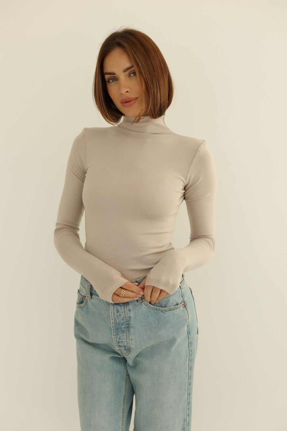Dopasowana bluzka w kolorze beżowym. Spodoba się fankom stonowanych, uniwersalnych odcieni. Przylegający fason fantastycznie wyeksponuje górne partie sylwetki, a dekolt z półgolfem ochroni szyję przed zimnem. Bluzkę damską włóż do pracy, zestawiając z czarnymi spodniami i butami na obcasie.