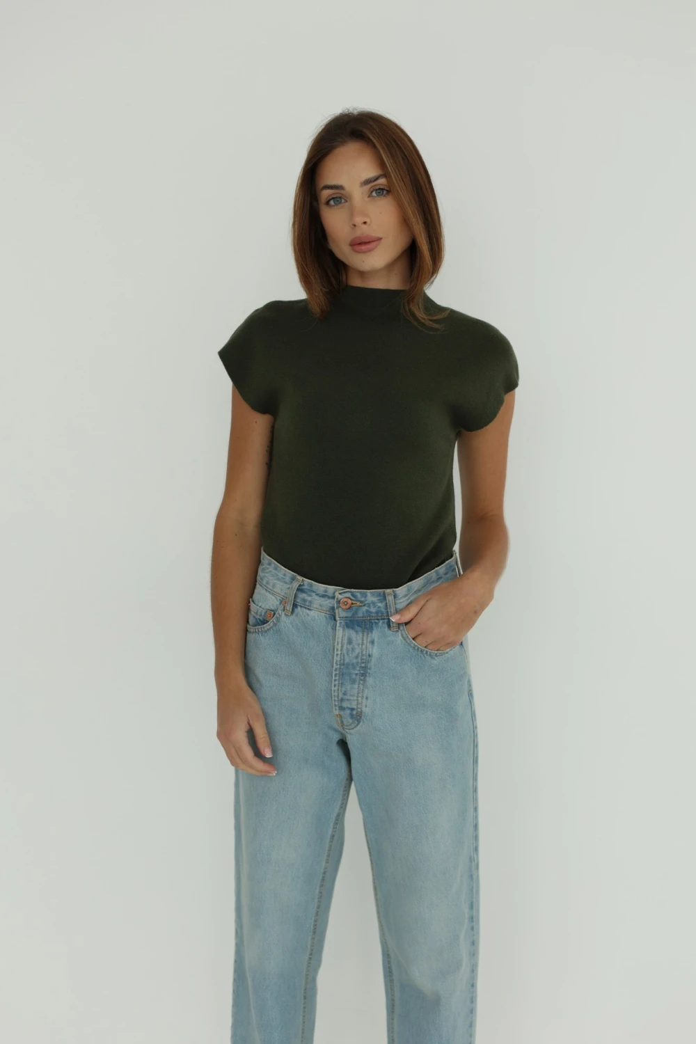Przylegająca bluzka damska w kolorze khaki. Zdecyduj się na nią, jeżeli lubisz proste, a jednocześnie eleganckie designy. Ten model będzie pasować właściwie do wszystkiego, dlatego możesz go zestawić zarówno z jeansami balloon, jak i cygaretkami. Dopasowaną bluzkę z półgolfem noś w sezonie jesienno-zimowym.