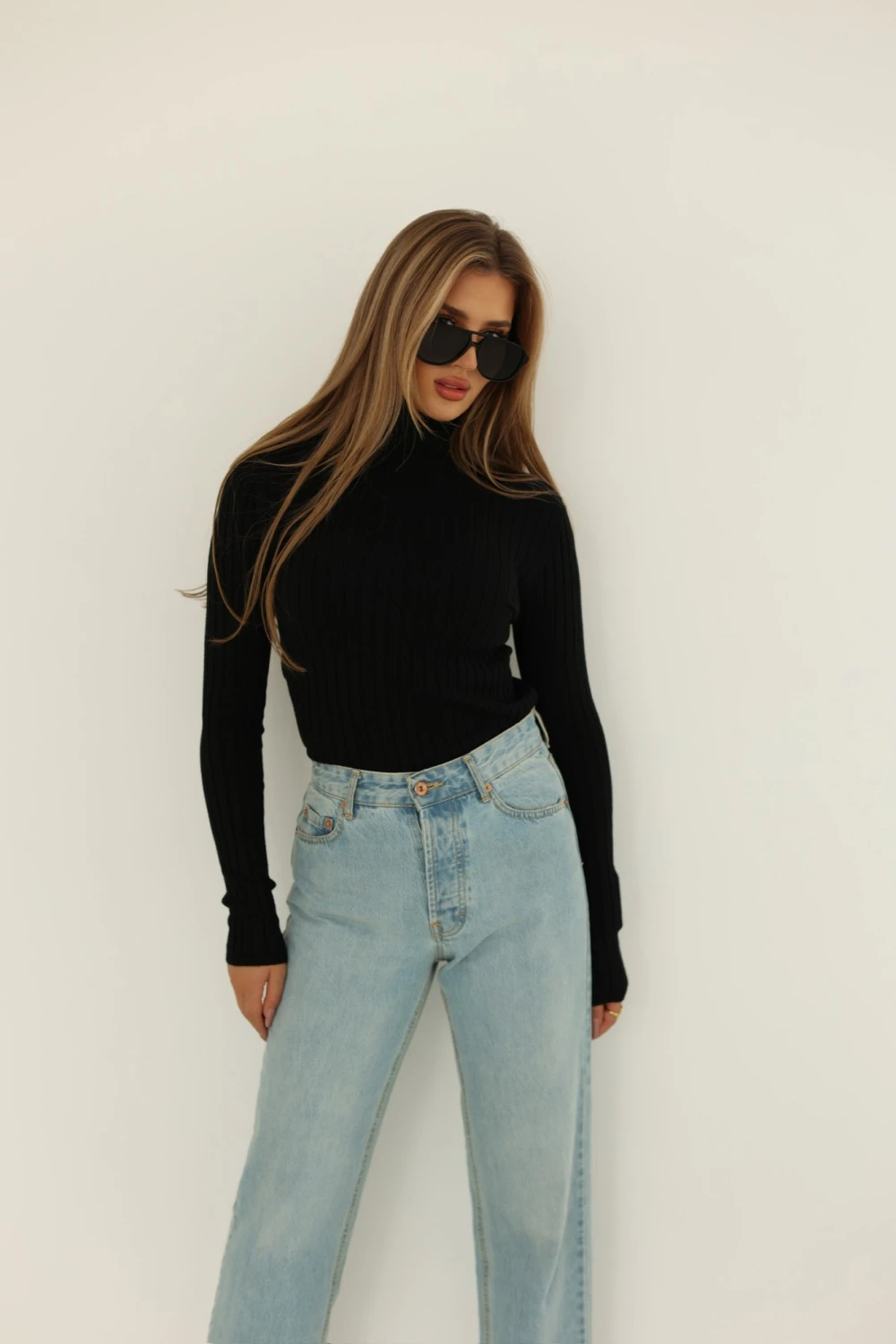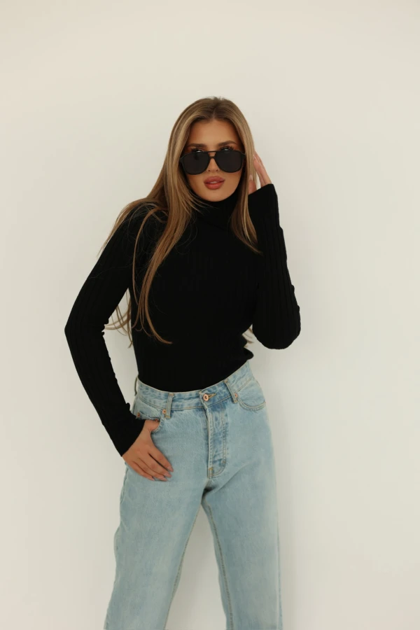 Klasyczny golf w kolorze czarnym. Jesteśmy pewni, że przypadnie do gustu fankom seksownych, przylegających fasonów i klasycznych, sprawdzonych odcieni. Ten model doskonale sprawdzi się jako podstawa imprezowego czy eleganckiego outfitu. Zestaw sweter damski z rozkloszowaną spódniczką i botkami na obcasie.