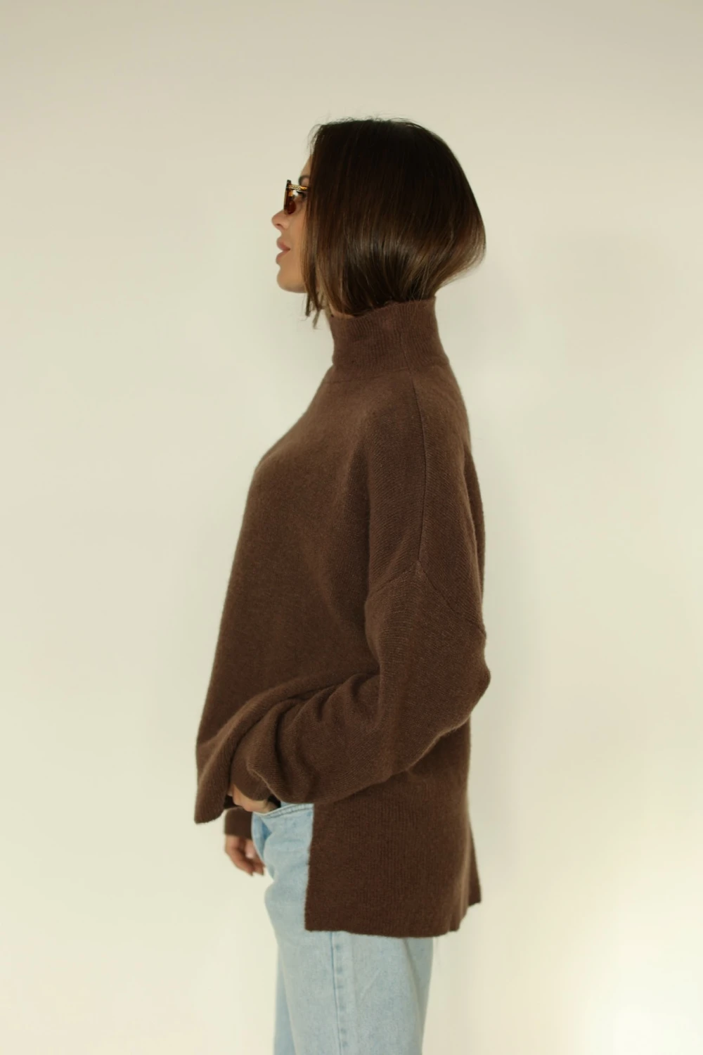 Oversize’owy półgolf damski w kolorze czekoladowym. Ten model najbardziej przypadnie do gustu fankom luźnych, wygodnych fasonów oraz ciepłych, wysokogatunkowych dzianin. Zdecydowanie warto zestawić go z dopasowaną spódniczką lub spodniami dresowymi. Gwarantujemy, że sweter stanie się jednym z Twoich ulubionych elementów garderoby.