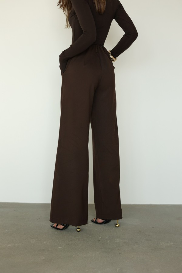 Spodnie Evel z prostą nogawką w kolorze czekoladowym to elegancja w codziennym wydaniu. Mają dopracowany, prosty krój, który pięknie wysmukla sylwetkę i dodaje stylizacji klasy. Wysoki stan podkreśla talię, a lekko rozszerzana nogawka nadaje im nowoczesnego charakteru.