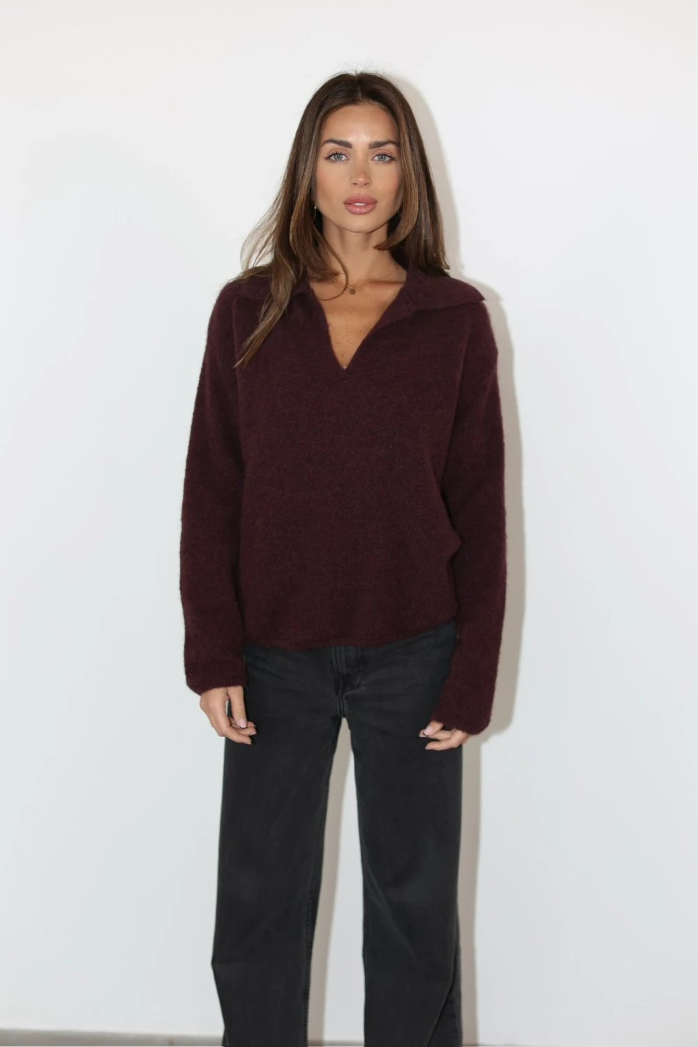 Oversize’owy sweter w kolorze bordowym. Został uszyty z przyjemnego w dotyku, ciepłego materiału, dlatego idealnie sprawdzi się w sezonie jesienno-zimowym. Model z kołnierzykiem może być podstawą casualowego looku. Połącz stylowy sweterek damski z białymi spodniami i botkami za kostkę. Musisz go mieć!