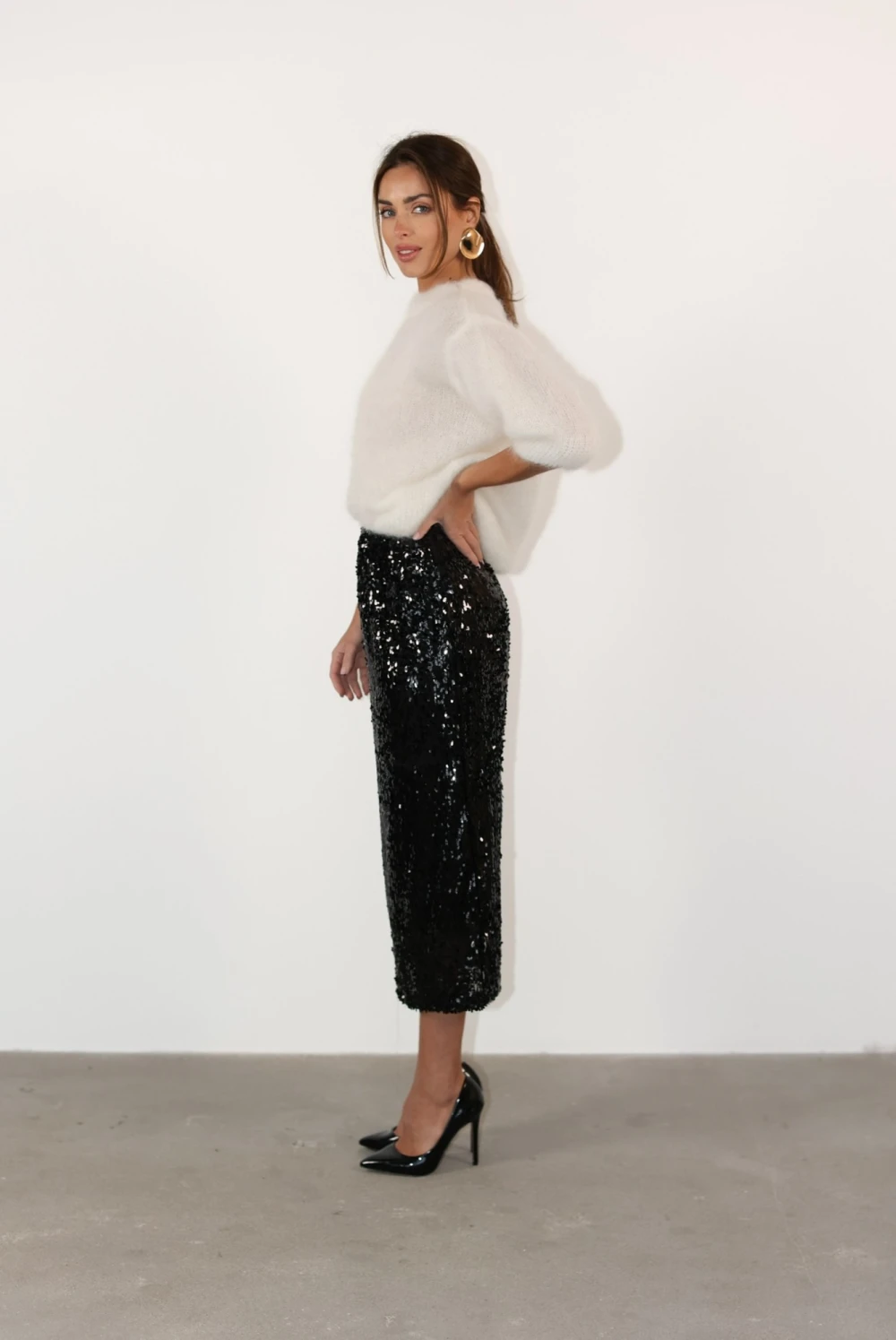 Piękna spódnica cekinowa w kolorze czarnym. Zdecyduj się na nią, jeżeli lubisz błyszczeć w tłumie! Jesteśmy przekonani, że ten model cudnie ułoży się na sylwetce i pozwoli cieszyć się fantastycznym lookiem. Włóż spódnicę midi na imprezę, zestawiając z bluzką longsleeve i butami na wysokim obcasie. Musisz ją mieć!