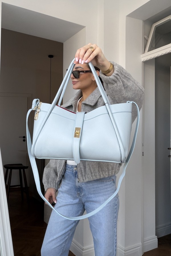 Sannah w odcieniu błękitu to elegancka i praktyczna torebka, która idealnie dopełni każdą stylizację. Wykonana z miękkiej, wysokogatunkowej skóry naturalnej, zachwyca minimalistyczną formą i subtelną kolorystyką. Wnętrze torebki wykończone kontrastującą czerwienią dodaje jej unikalnego charakteru, a dołączona kosmetyczka w tym samym kolorze pozwala utrzymać porządek w środku. Złote detale dopełniają całość, nadając torebce szykownego wyglądu. Beżowy odcień świetnie komponuje się z jasnymi, pastelowymi oraz ciemniejszymi ubraniami – będzie Twoją bazą na cały rok.