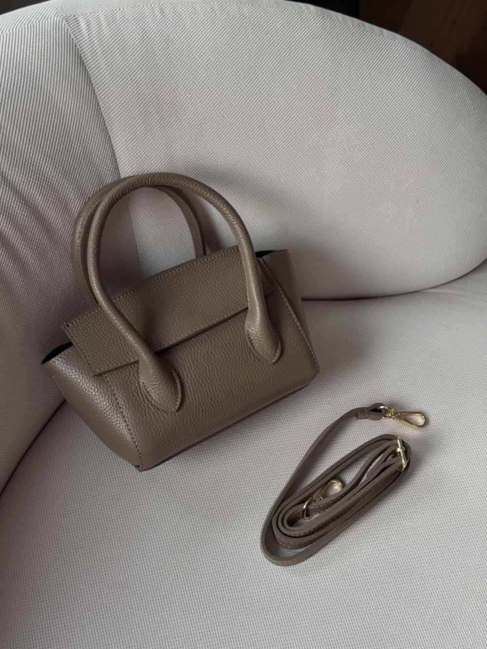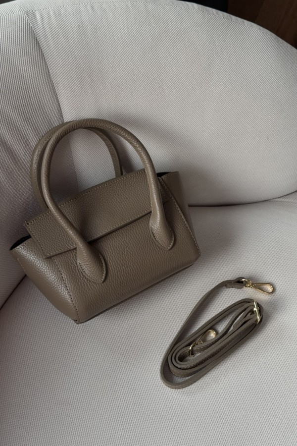 Skórzana torebka z paskiem w kolorze taupe. Wyróżnia się nie tylko świetną jakością, ale bardzo modnym odcieniem. Noś ją przez całą wiosnę, zestawiając z bomberką, trenczem, ramoneską czy kataną jeansową. Torebka damska o kształcie kuferka będzie pasować zarówno do oficjalnych, jak i casualowych looków.