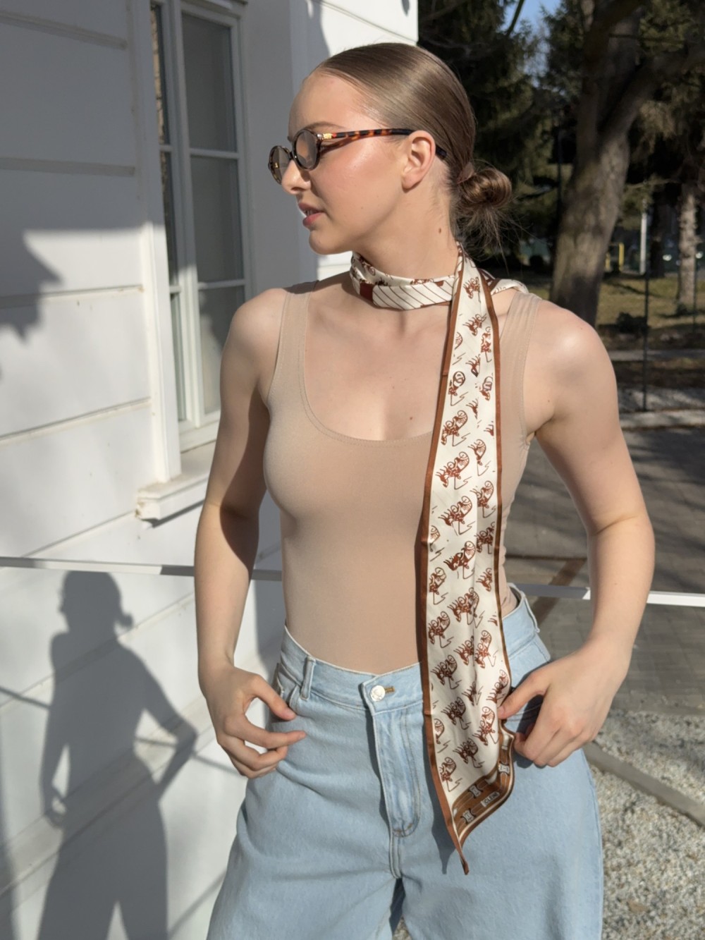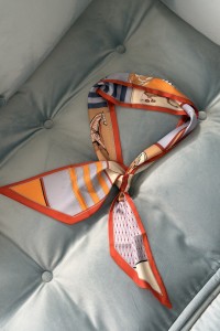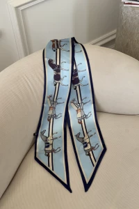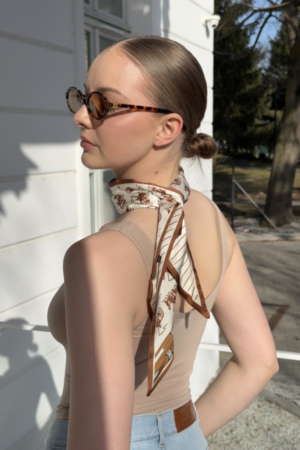 Apaszka Hermia Mały dodatek, a potrafi zmienić wszystko. Lekko połyskująca tkanina i elegancki print sprawiają, że stylizacja zyskuje dopracowany charakter. Idealna do codziennych i bardziej eleganckich zestawów – zawsze dodaje kobiecej lekkości.