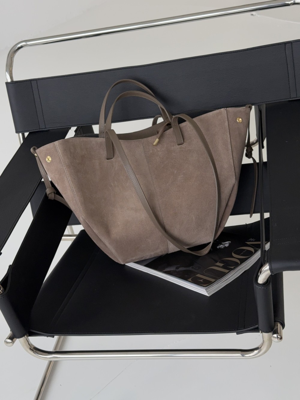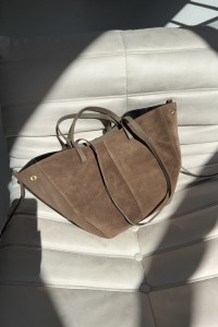 Skórzana torebka zamszowa Poli maxi fango to model, który pokochasz od pierwszego użycia. Wykonana w 100% z naturalnej skóry, zachwyca miękką fakturą i subtelnym połyskiem charakterystycznym dla zamszu. Jej minimalistyczna forma świetnie wpisuje się w styl capsule wardrobe, a kolor fango – głęboki, ziemisty odcień – pasuje zarówno do ciepłych beży, jak i klasycznej czerni czy bieli. Złote okucia dodają całości szlachetności, a skórzane rączki gwarantują trwałość na lata. Możesz nosić ją rozłożoną lub złożoną – zależnie od tego, ile rzeczy akurat zabierasz.